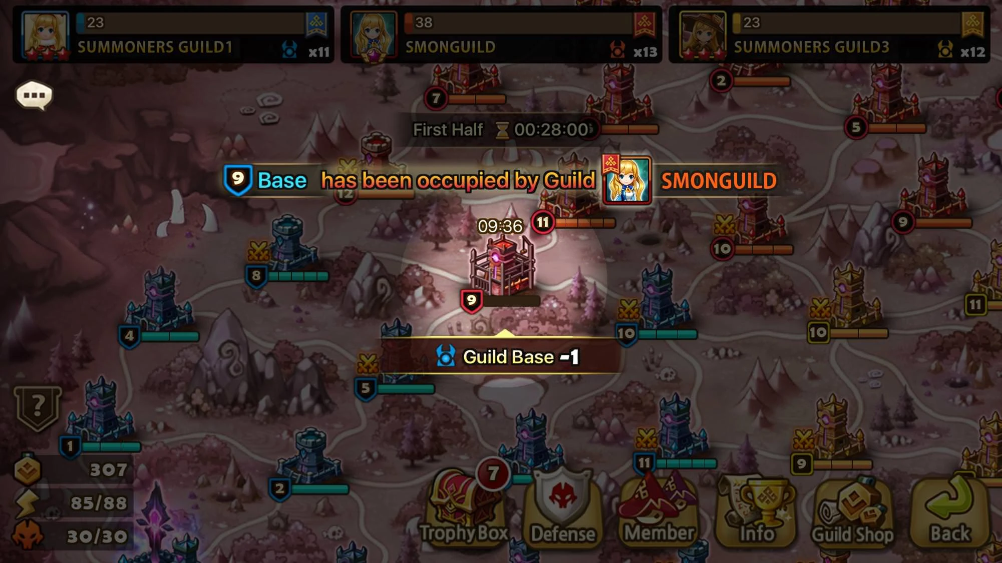 Guilds can only attack bases which are near a currently controlled base. Additionally, only natural 4-star monsters and below can be used to attack or defense a small base. Small bases will appear physically smaller on the field compared to the other bases. If a base has been defeated and occupied by another guild, all defense formations will automatically return to the headquarters.