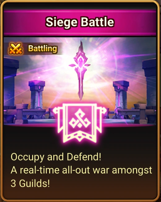 A Siege Battle is a type of Free for All Guild Battle taking place between three Guilds. Each Guild is positioned on opposite sides of a battlefield, with the goal being to occupy the various Bases scattered around. Siege Points are awarded to each guild based on the number of bases occupied, and the amount of time they are occupied. The Guild which reaches 20,000 points before the time limit expires wins the Siege Battle. If no Guild is able to reach the 20,000 point threshold in time, Guild ranking is determined by the amount of Siege Points accrued by each Guild before time expired.