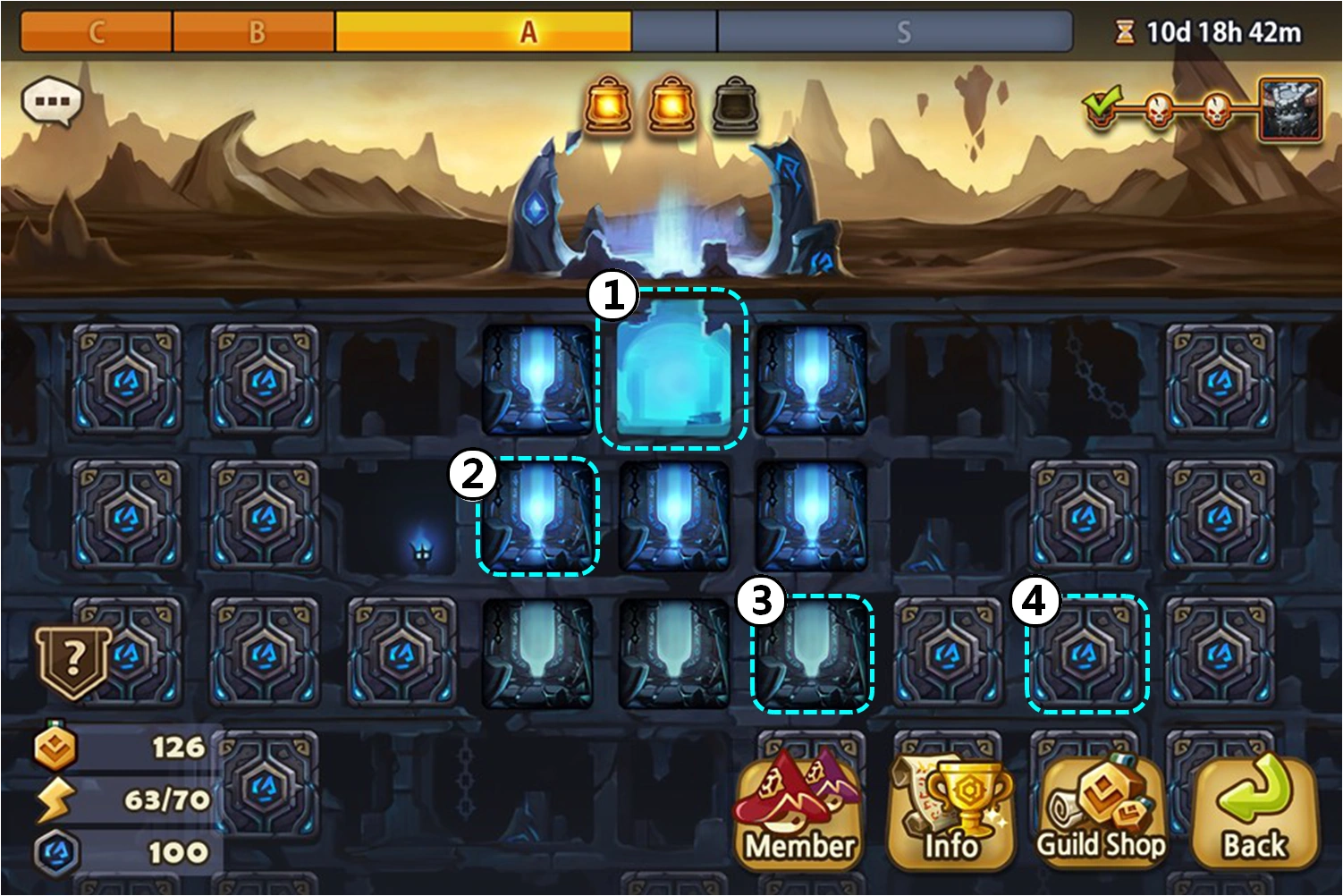 The Labyrinth is a non-linear tile based dungeon in which players must progress by clearing stages of various enemy monsters. Players will begin on a starting tile, and can only explore and clear adjacent tiles/stages. Clearing a tile or stage requires accruing a certain threshold for Clear Points, which are gained for each time that players are able to defeat all monster waves for that stage. Clear points gained by any one member will count toward the threshold for the entire guild. The amount of Clear Points awarded will depend on the difficulty level at which the stage monsters were cleared.